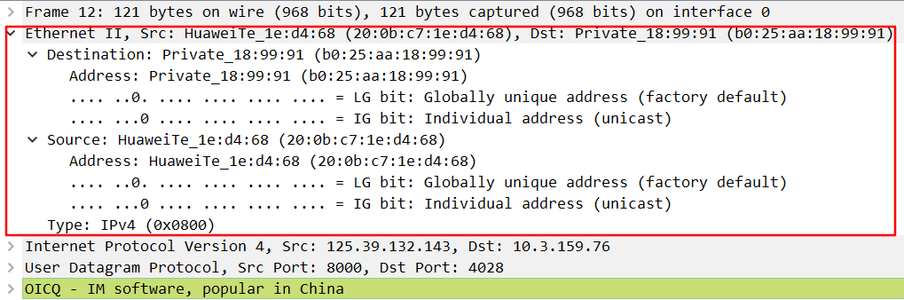 上图就是Wireshark工具抓包截图,主要看红色框标注,这就是Ethernet的底层数据信息,知道张什么样子了吧。
